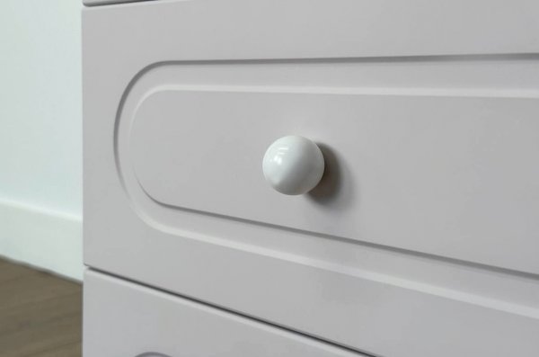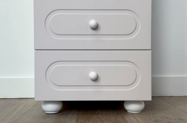 Корпус выполнен из ЛДСП толщиной 16 мм, фасад изготовлен из МДФ в плёнке ПВХ и декорирован фрезеровкой, характерной для серии Милана. Оригинальные круглые ручки и опоры завершают образ, подчёркивая аккуратный и современный дизайн мебели.