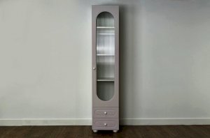 Модель оснащена одной распашной дверцей с вставкой из прозрачного рифлёного стекла, а также двумя вместительными выкатными ящиками в нижней части для хранения одежды, текстиля или аксессуаров. Внутреннее наполнение можно выбрать в зависимости от задач: шкаф комплектуется полками или штангой для плечиков, что позволяет адаптировать его под разные потребности.