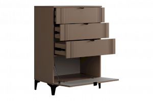 Комод изготовлен из качественных материалов: корпус выполнен из ЛДСП, что гарантирует прочность и долговечность, а фасад, выполненный из МДФ в плёнке ПВХ, не только выглядит эстетично, но и защищает комод от повреждений. Особое внимание заслуживает фрезеровка фасадов, которая придаёт изделию изысканный вид.